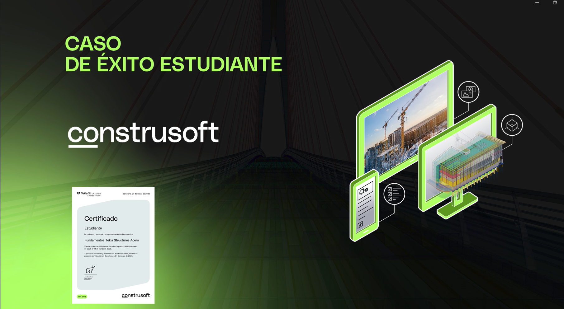 En este video, conoce la historia de Santiago Peralta, quien decidió potenciar su carrera profesional formándose en el curso Fundamentos Tekla, el software líder en modelado BIM. Gracias a su dedicación y al poder de esta herramienta, Santiago no solo adquirió habilidades técnicas de alto nivel, sino que también logró impulsar su crecimiento profesional y participar en proyectos de gran impacto.